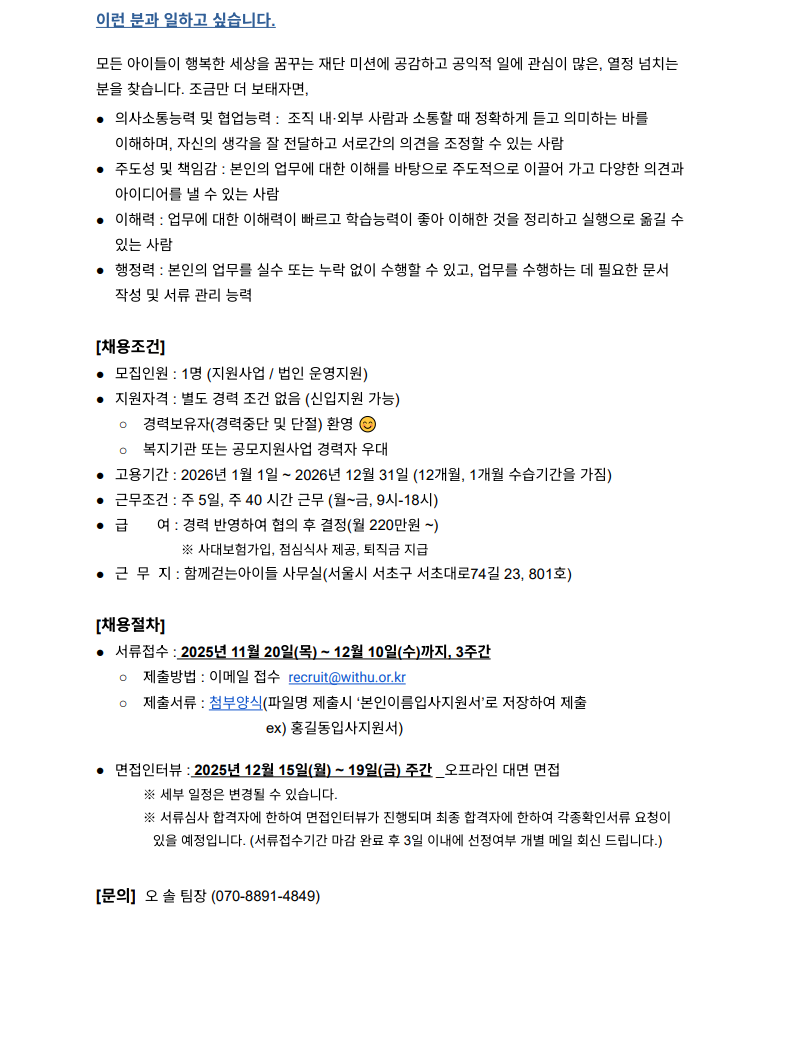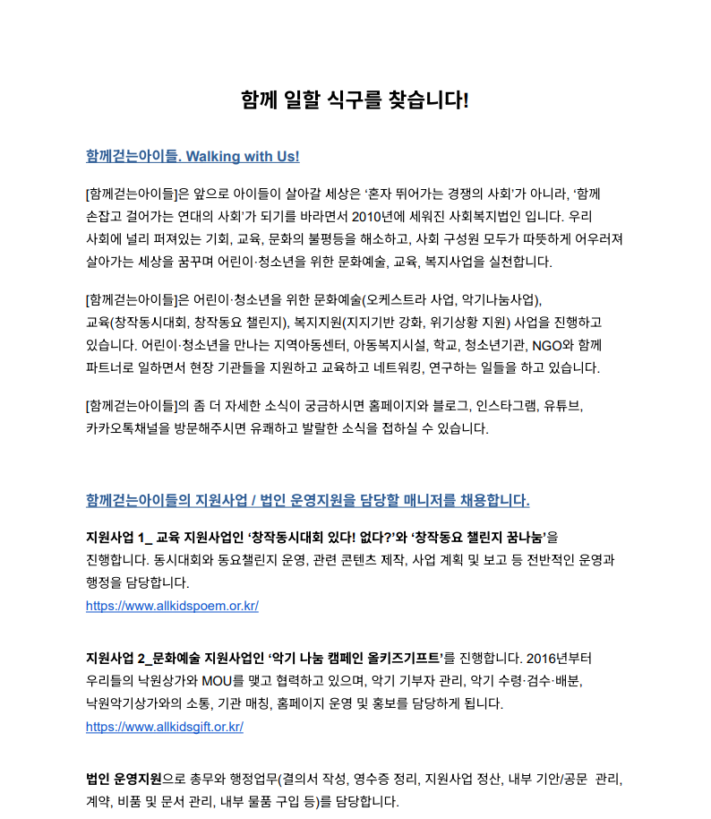 ÇÔ²²°È´Â¾ÆÀ̵éÀÇ Áö¿ø»ç¾÷ / ¹ýÀÎ ¿î¿µÁö¿øÀ» ´ã´çÇÒ ¸Å´ÏÀú¸¦ ä¿ëÇÕ´Ï´Ù.
